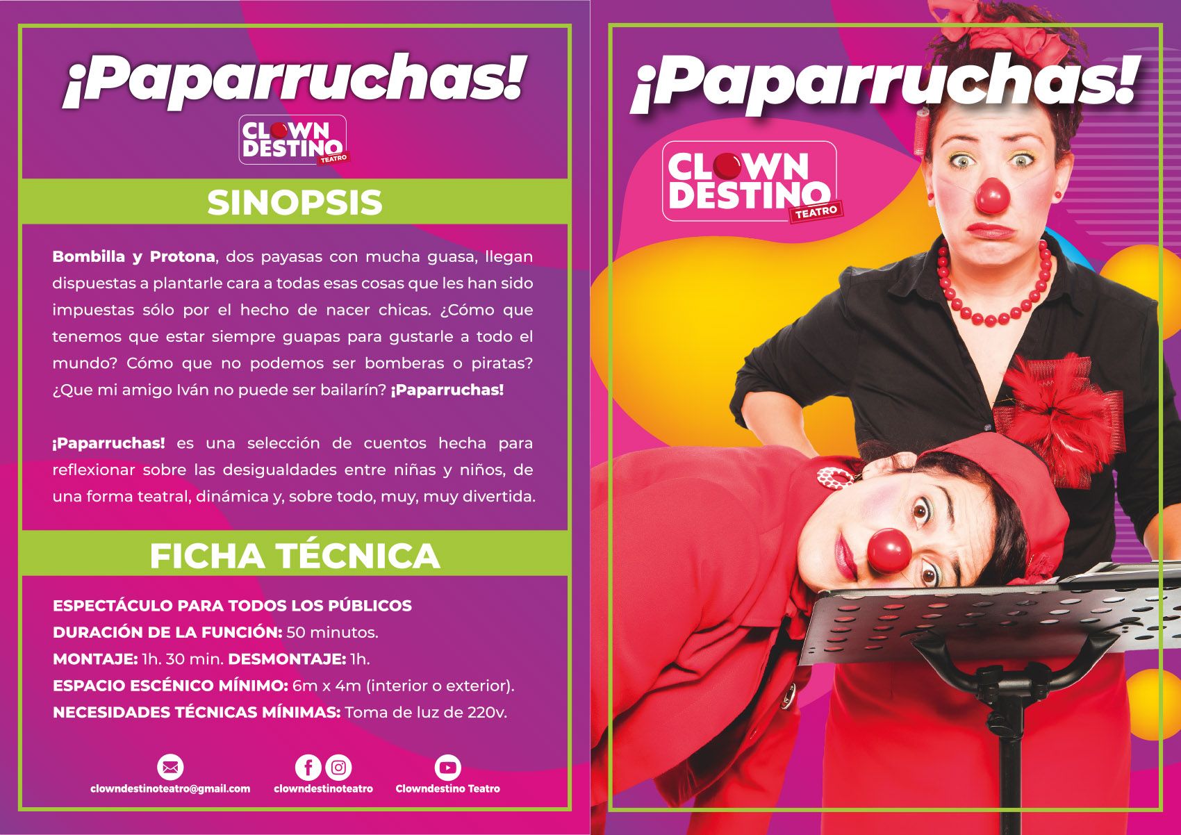 Bombilla y Protona, dos payasas con mucha guasa, llegan dispuestas a plantarle cara a todas esas cosas que les han sido impuestas sólo por el hecho de nacer chicas. ¿Cómo que tenemos que estar siempre guapas para gustarle a todo el mundo? ¿Cómo que no podemos ser bomberas o piratas? ¿Que mi amigo Iván no puede ser bailarín? ¡Paparruchadas!